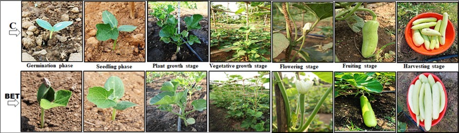 Figure 1.Representative images depict the progression of vegetative growth characteristics in bottle gourd across various developmental stages. C: Control group; BET: Blessing/biofield energy treatment group.