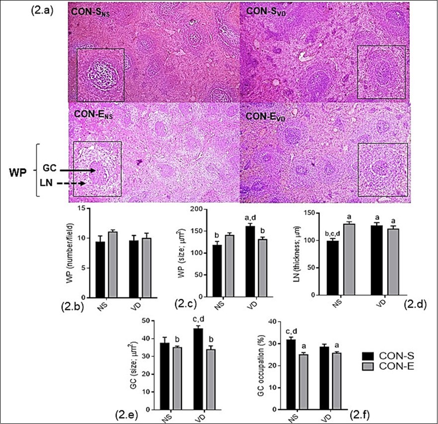 Neither VD supplementation nor exercise significantly altered WP number in the spleens of CON rats (Figures 2.a - b). However, VD supplementation alone altered the total area of the WP (F1,18 = 5.336; p = 0.0330), where the spleens of CON-SVD rats presented a larger WP area (36.44%), compared to those of the CON-SNS rats (p<0.05). Moreover, the WP area was also influenced by the combination of VD supplementation and exercise (F1,18 = 13.30; p = 0.0018); the mean WP area of the spleens of CON-EVD rats was 18.49% larger than the mean WP area of spleens from CON-SVD rats (Figure 2.c; p<0.05). Exercise practice influenced LN thickness (F1,18 = 5.791; p = 0.0271), where CON-ENS rats presented a thicker LN (31.28%) than CON-SNS rats. Additionally, the combination of exercise and VD supplementation affected LN thickness (F1,18 = 12.61; p = 0.0023); animals from the CON-SVD and CON-EVD groups presented larger LN (28.35% and 22.29%, respectively) than that of the CON-SNS rats (Figure 2.d). The GC percentage was affected by exercise (F1,18 = 17.58; p = 0.0005), where the spleens of the CON-ENS and CON-EVD groups presented lower percentages of GC occupation (21.06% and 19.11%, respectively), in relation to that of the spleens of the CON-SNS group (Figures 2.e - f).