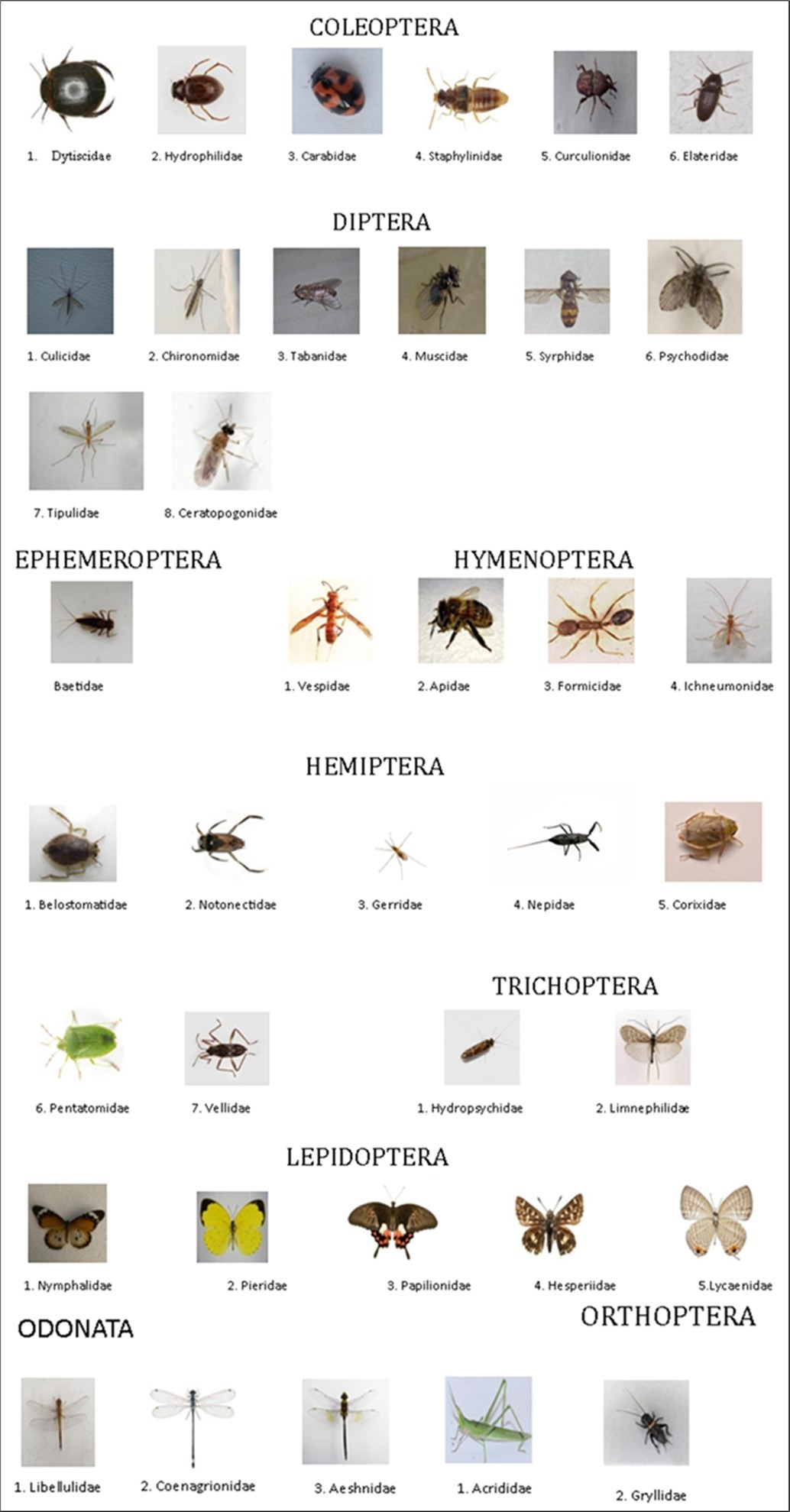 Insect specimens collected from the field were preserved in 70% ethanol for aquatic species and mounted for dry storage for terrestrial species. Each specimen was carefully labelled with the site, date, and collection method.